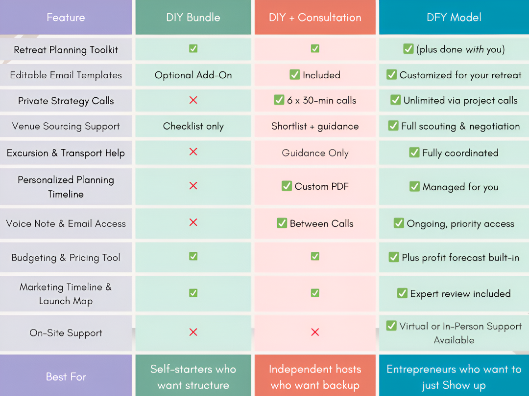With DIY + Consultation, you get all the tools from our DIY package plus SIX 30-minute strategy calls over 3 months to fuel your success. Perfect for the motivated entrepreneur who’s ready to execute but wants guidance from someone who’s been there and knows how to make a retreat unforgettable.Whether it’s refining your schedule, pricing your offer, or getting unstuck, your private consult gives you the clarity and confidence to move forward like a pro.